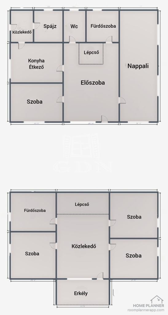 Földszint (85 m²): tágas, 30 m²-es nappali, előszoba, egy hálószoba, konyha–étkező, külön fürdőszoba és WC, spájz, valamint két bejárat – így az elosztás akár két különálló élettér kialakítására is alkalmas.