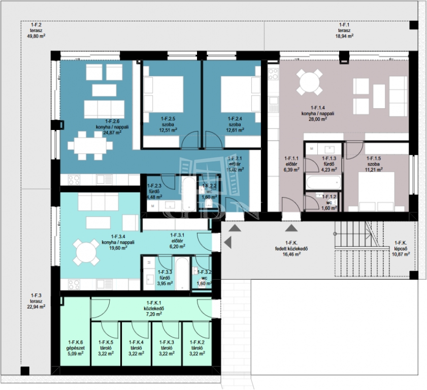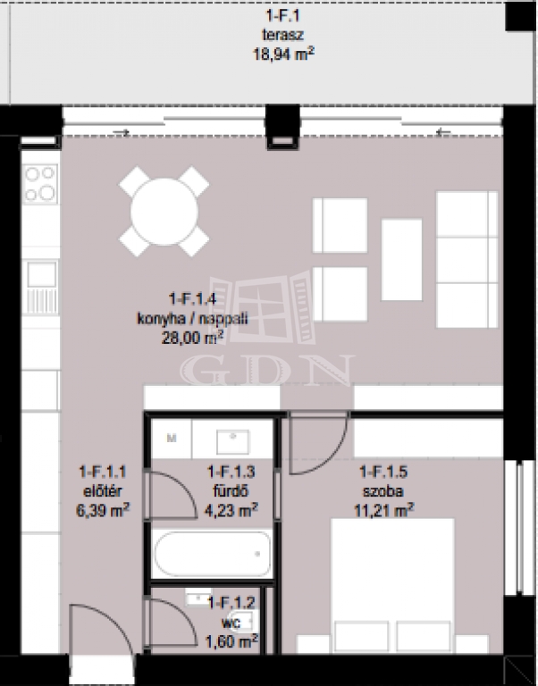 A LAKÁS a földszinten található. 51 nm lakótér, 19 nm terasz, kertkapcsolat. Amerikai konyhás nappali, hálószoba, közlekedő/gardrób, fürdőszoba, WC.
