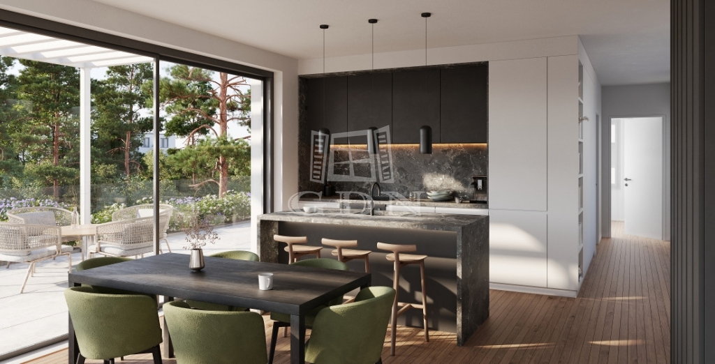 A terasz a nappaliból elérhető. Tágas, világos terek jellemzik.