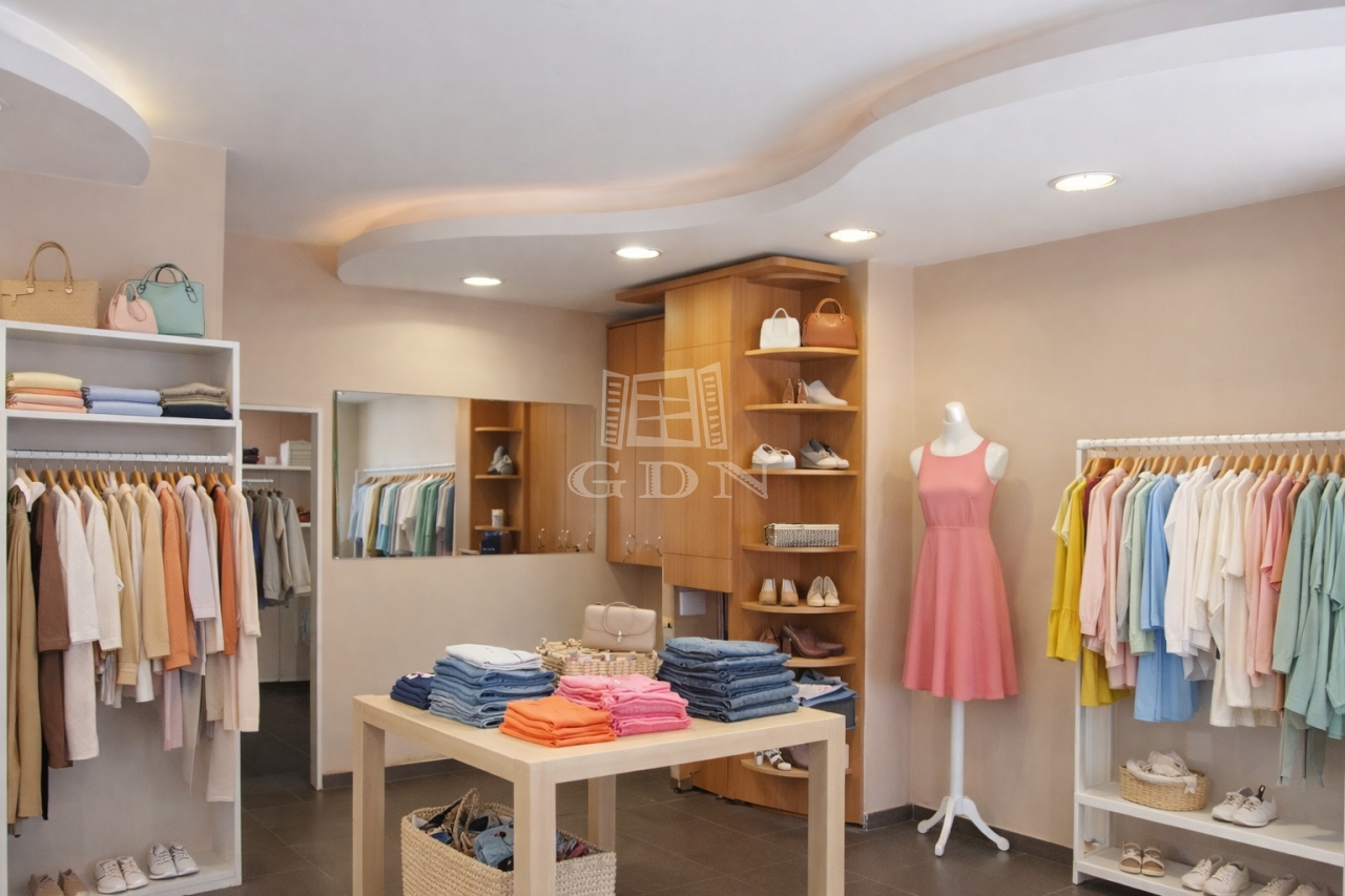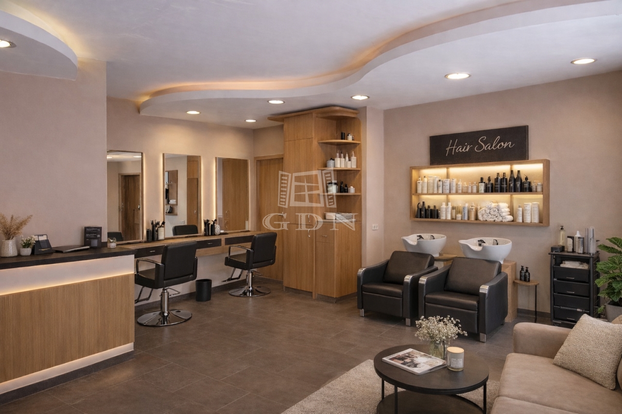 A főoldalon és az első képen látható enteriőr illusztráció, amely egy lehetséges butik, szépségszalon vagy fodrászat kialakítását mutatja be – a tér könnyen újrapozicionálható a célpiac igényei szerint.