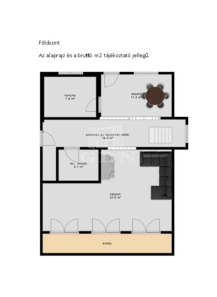 • Földszint: világos, napfényes nappali egyedi elválasztófallal, tágas