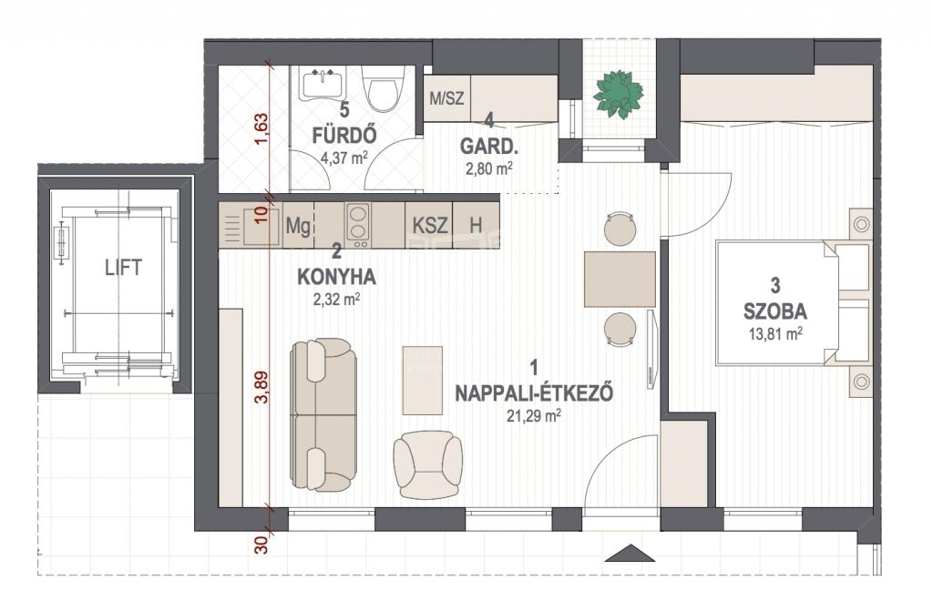 | 44 m2Alapterület | 1 + 1 Szoba |