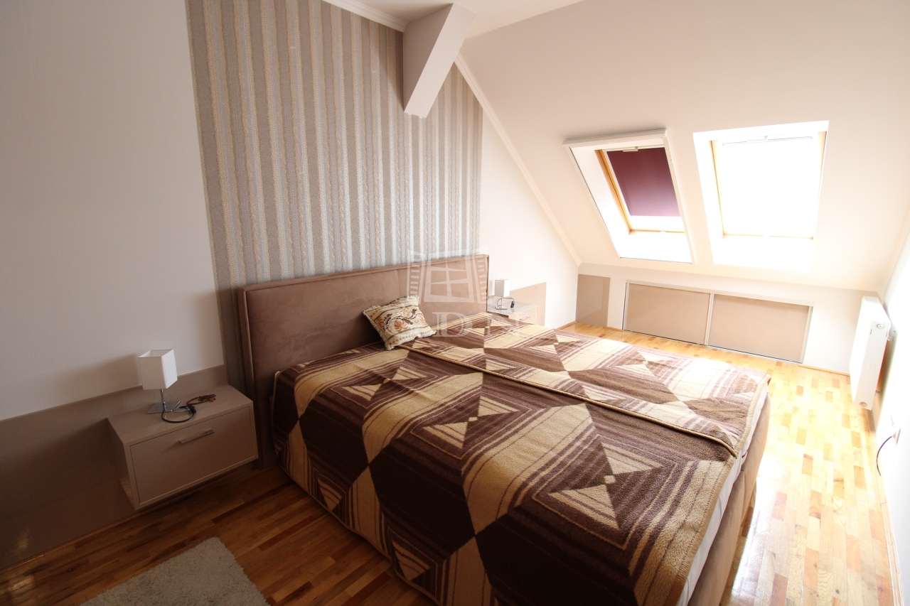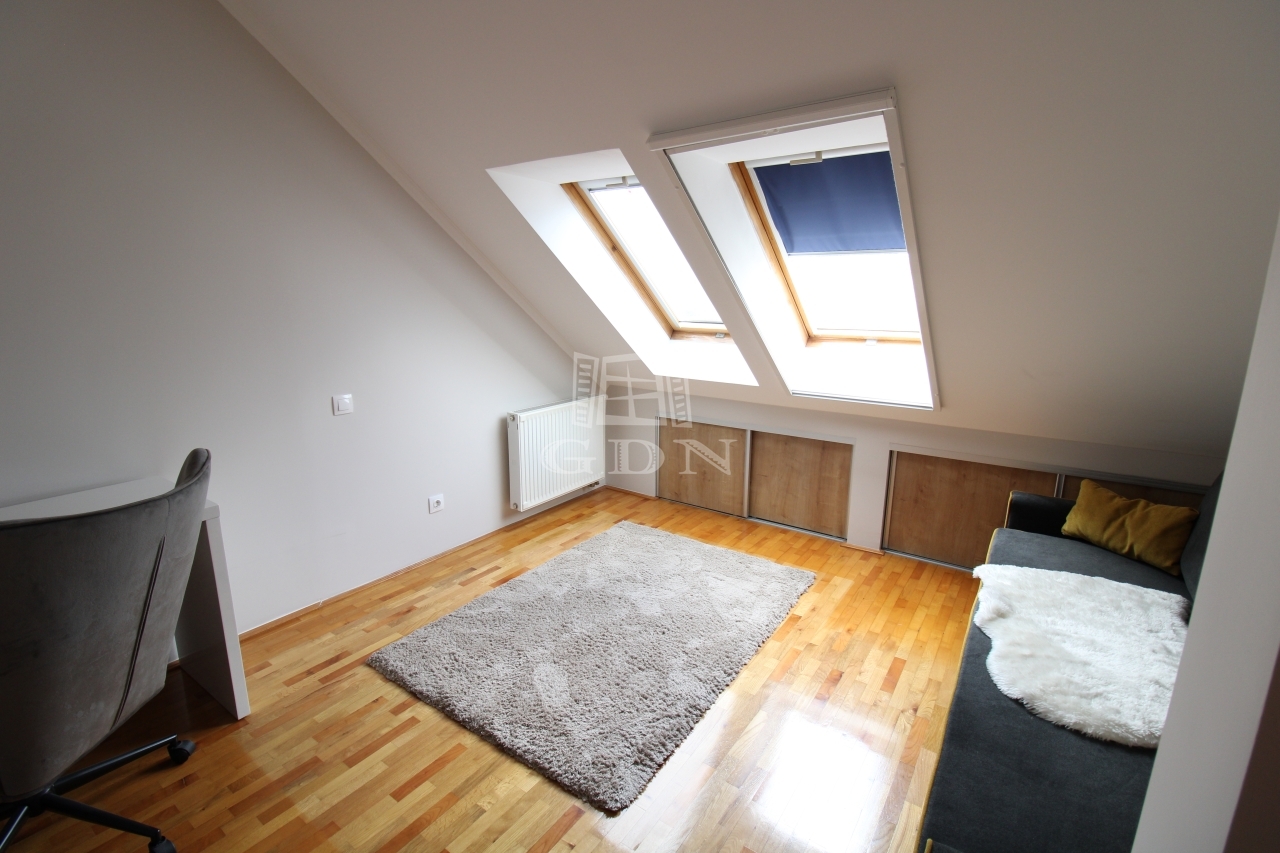 A felső szintre egy kényelmes fokkiosztású lépcsőn juthatunk fel, ahol is a br. 14nm terjedelmű világos előszoba (itt akár külön dolgozó vagy közösségi tér is kialakítható) valamint a 6nm-es kádas duplamosdós fürdő, kettő egyenként br.15,6 és 14nm terjedelmű hálószoba és egy közel 5nm es gardrób került kialakításra.