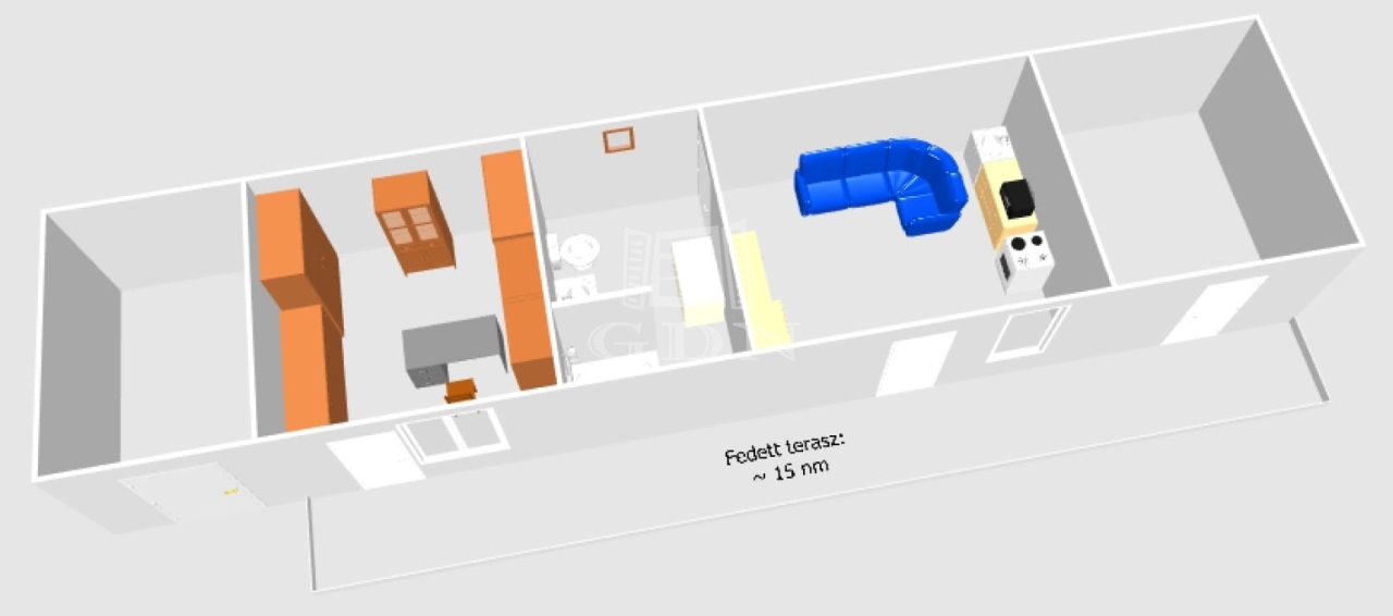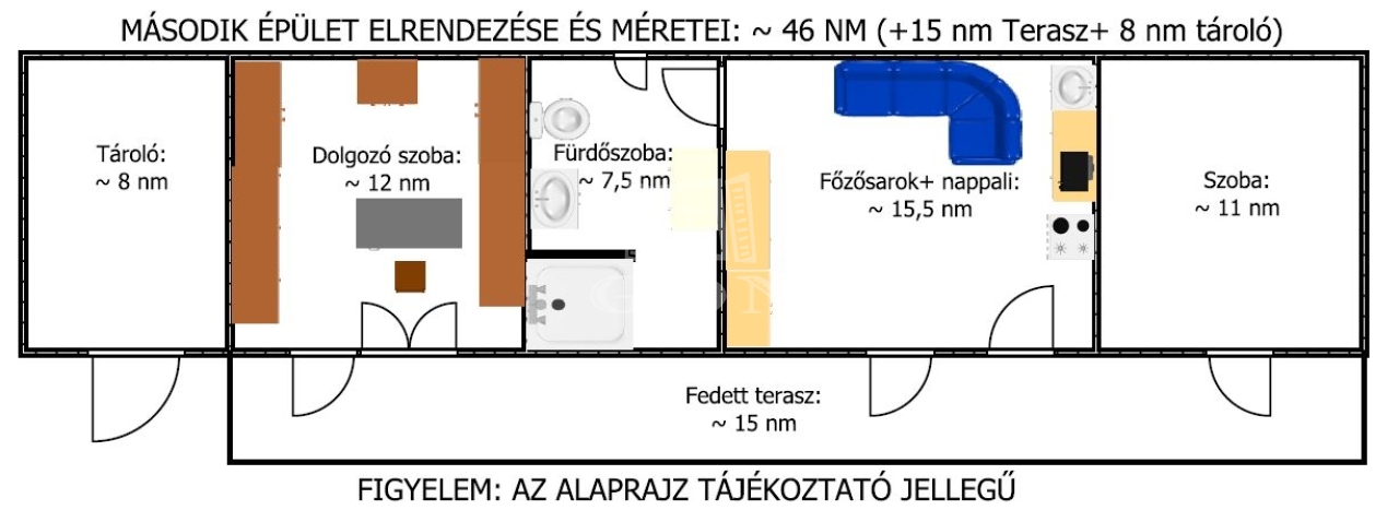 A második épület hasznos alapterülete 46nm (+ 15 nm fedett terasz) melyben található: