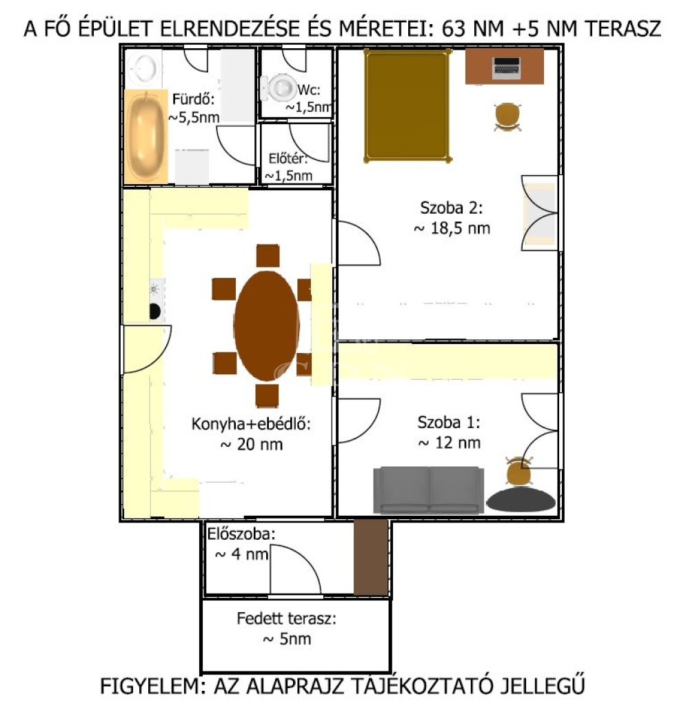 A fő épület hasznos alapterülete 63nm (+ 5 nm fedett terasz) melyben található: