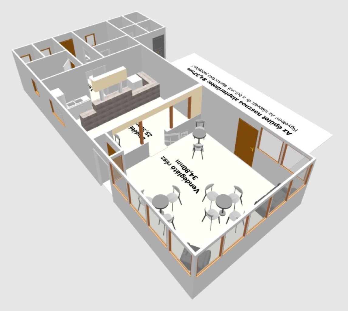 Ez az épület Kálmánháza egyetlen fagyizója és vendéglátó egysége, mely üzletileg a legjobb helyen található a településen. A vendéglátóhelység 1985-ben épült beton alapon tufa falazattal. A tetőszerkezete nyeregtető cserépfedéssel ellátva. Az épületben háromfázisú áram (3×16A), víz, csatorna és gáz be van kötve. Az épület gázkonvektoros fűtéssel van ellátva, de rendelkezésre áll még egy jó állapotú szép nagy kandalló is.