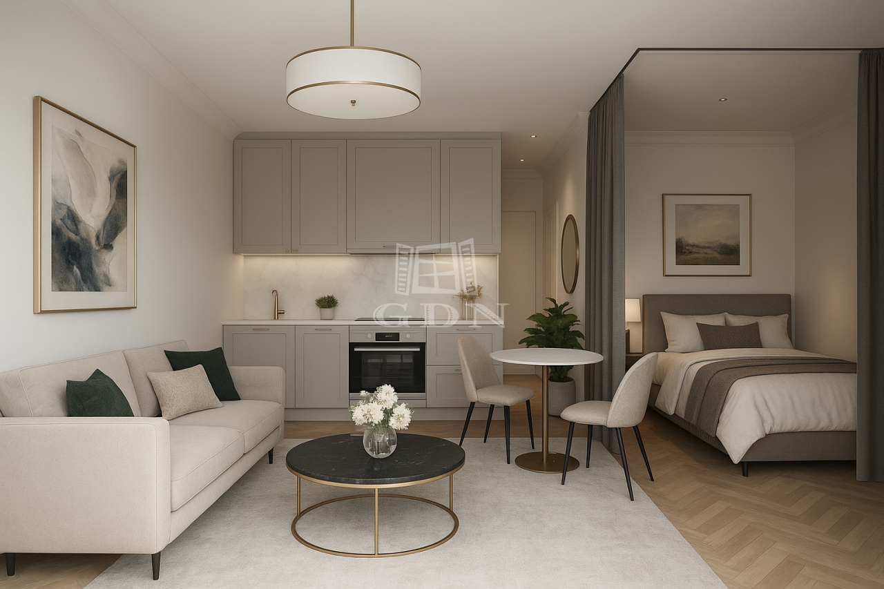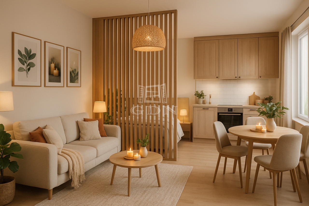 A lakás a tervek alapján amerikai konyhás nappali, hálófülke, fürdőszoba, és előtér térfelosztású.