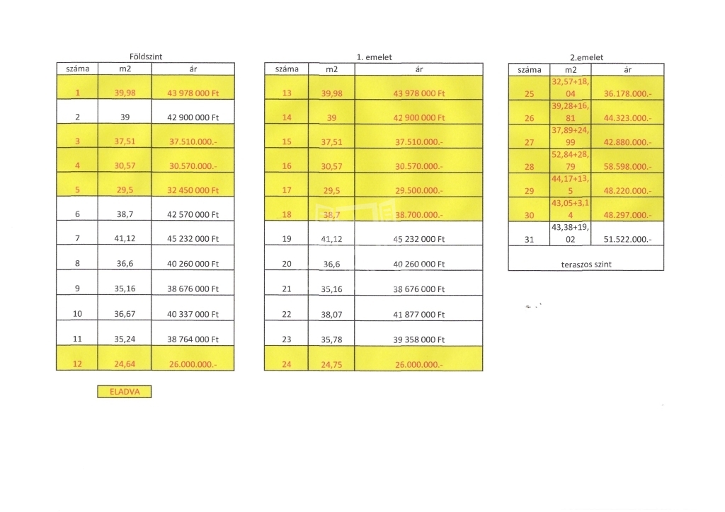 A feltüntetett ár földszint 2-es lakásra vonatkozik, 39 m2 lakótér, helyiségei: amerikai konyhás nappali, szoba, előtér, fürdőszoba.