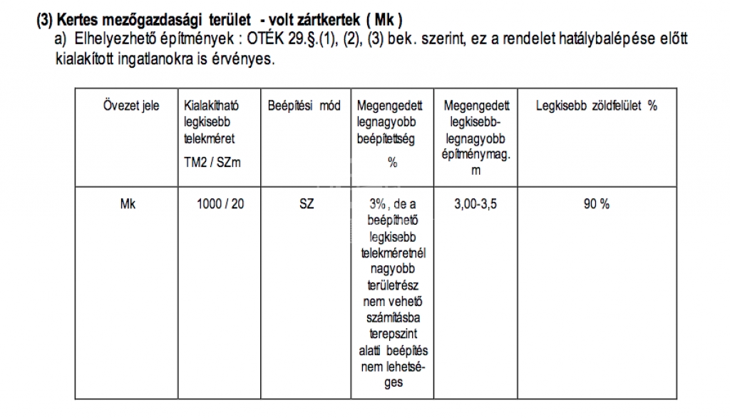 -a legnagyobb megengedett beépítettség 3%, de a beépíthető legkisebb telekméretnél nagyobb területrész nem vehető számításba, terepszint alatti beépítés nem lehetséges, ami ezen az MK területen max 1000 m2.