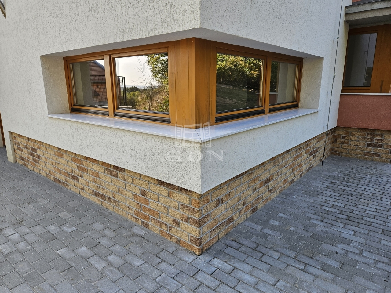 • Fa, több réteg üvegezésük, hő- és hangszigetelt nyílászárók, kő párkányokkal.