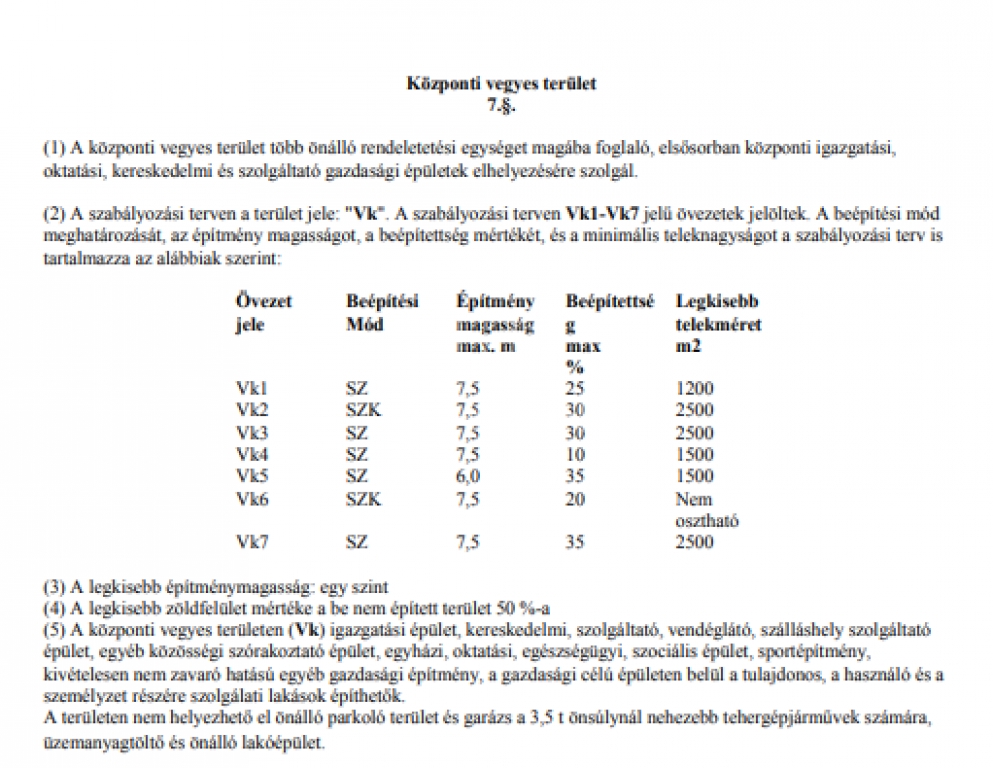 A 29.271 m2 nagyságú terület Vk7-es övezeti besorolású.
