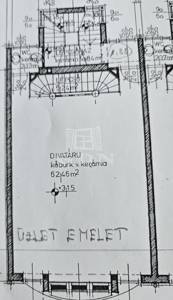 Emelet (62 m²): üzlettér, WC, tároló