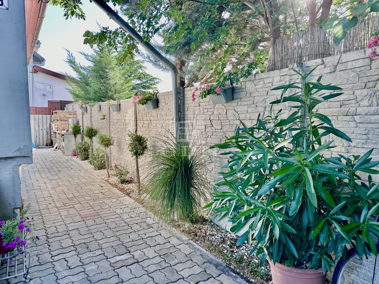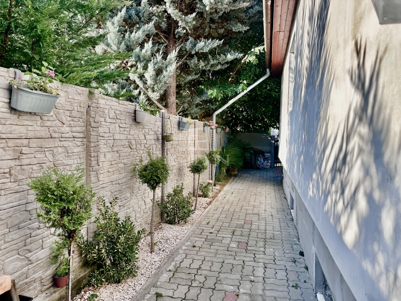 A telek, sarkon helyezkedik el, így a 2 generáció, 2 külön bejáraton közelítheti meg saját lakrészét.