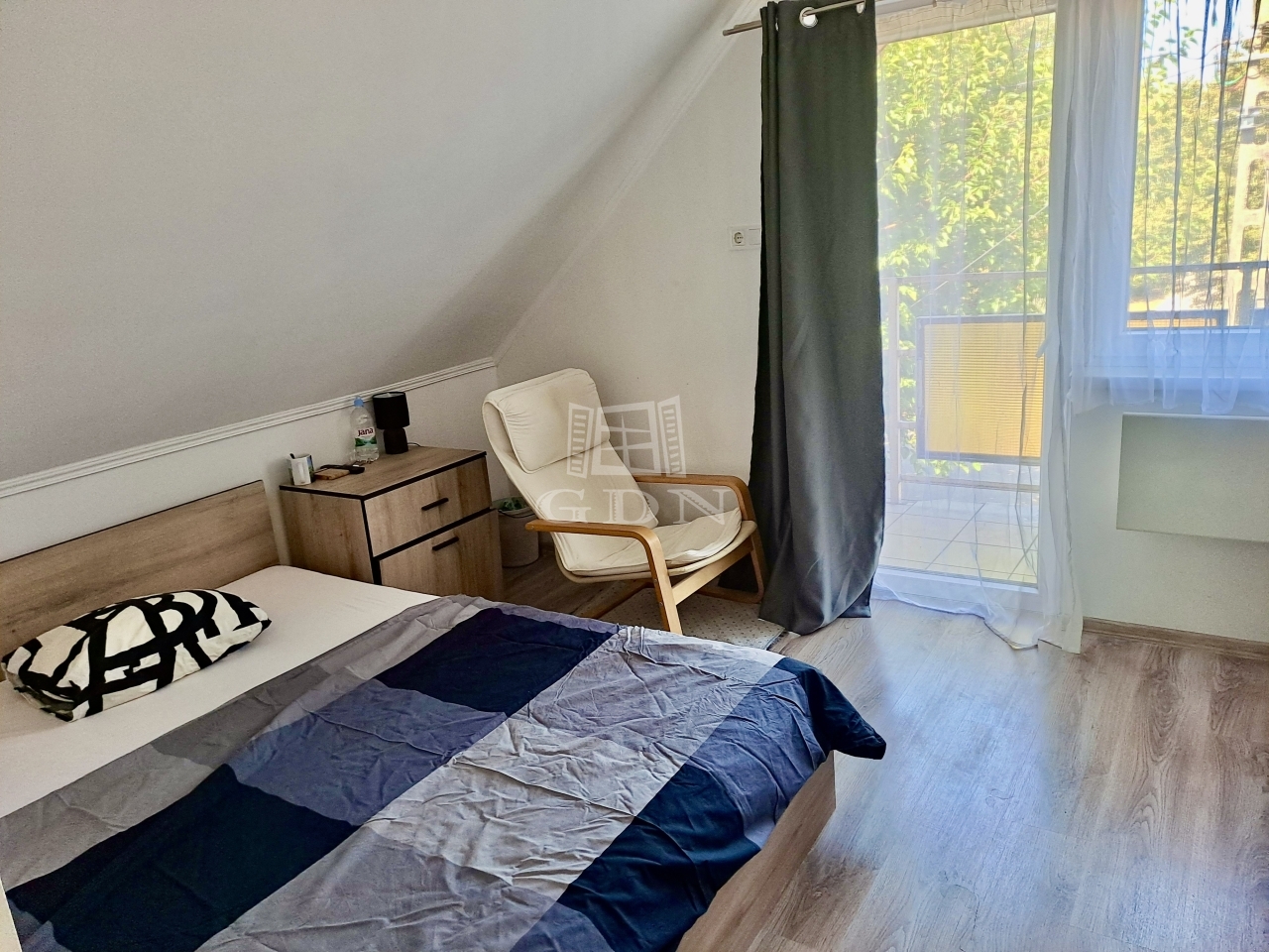 Az első lakrészbe belépve egy tágas, beépített konyhabútoros konyha étkezővel fogad minket! Innen nyílik egy wc ami háztartási helyiségként is funkciónál, itt található a mosógép, valamint egy korszerű bojler is. Ebből a helyiségből tudunk felmenni a felső szintre. Az emeletre felérve, egy kis nappaliba érkezünk, ahonnan nyílik egy tágas, káddal ellátott fürdőszoba, valamint 2 szoba és egy kis közlekedő. A kisebb szobából egy erkélyre is kiléphetünk.