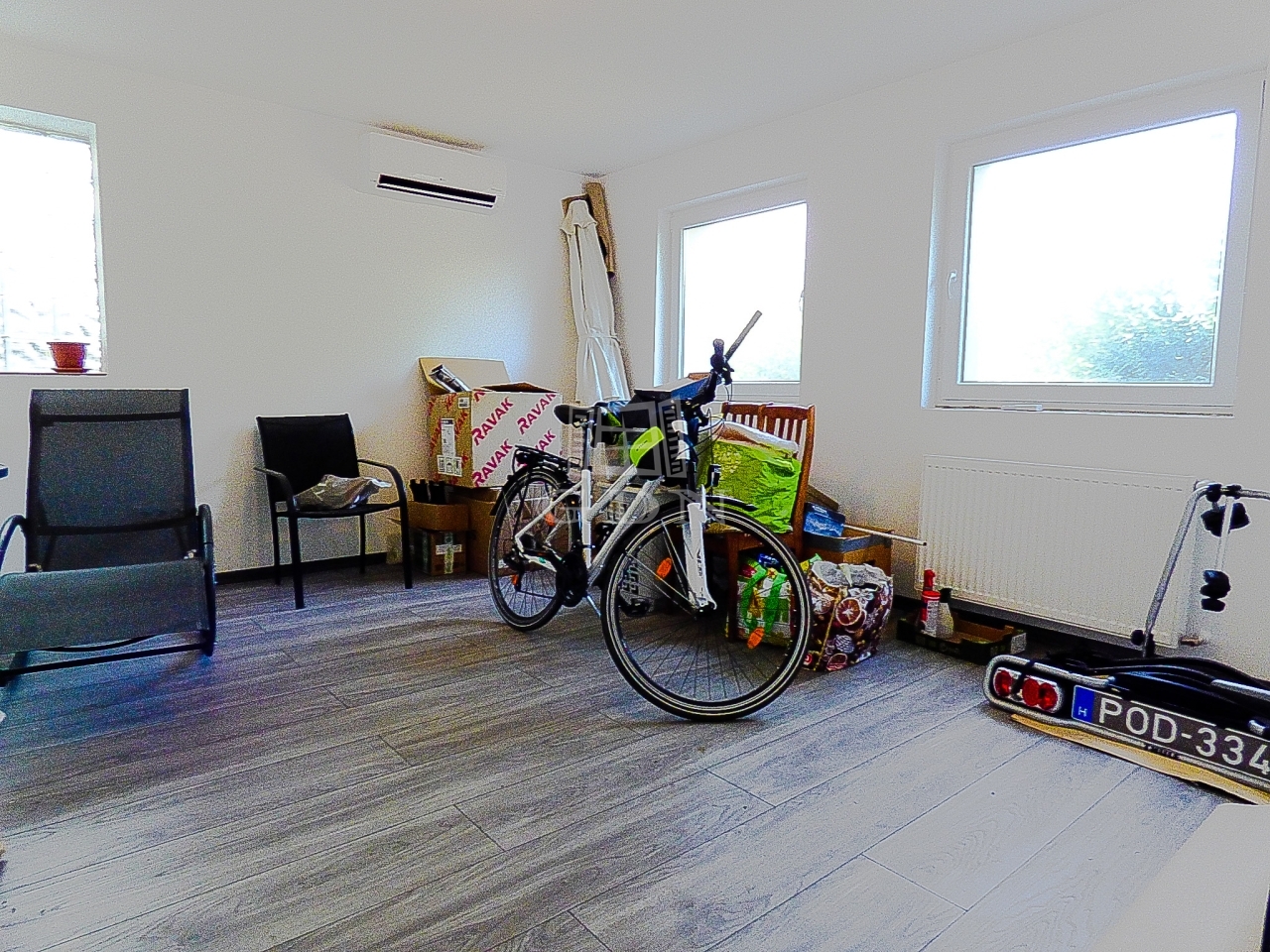 A zárt udvaron 2 autóval meg lehet állni, a kertben egy nagy terasz (25 nm), boros pince (8nm), tároló, bográcsozó kapott helyet.