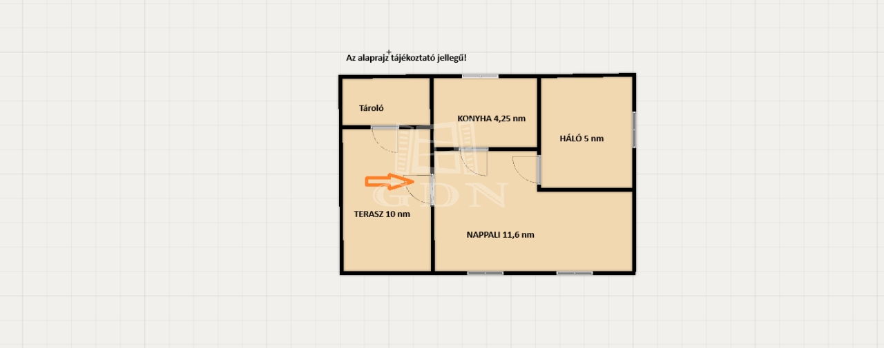 11,6 nm-es nappali, 5 nm-es háló, 4,25 nm-es konyha, 10 nm-es terasz, és 1,2 nm-es külső tároló kapott helyet. Mögötte szaletli, előtte fedett autóbeálló található.
