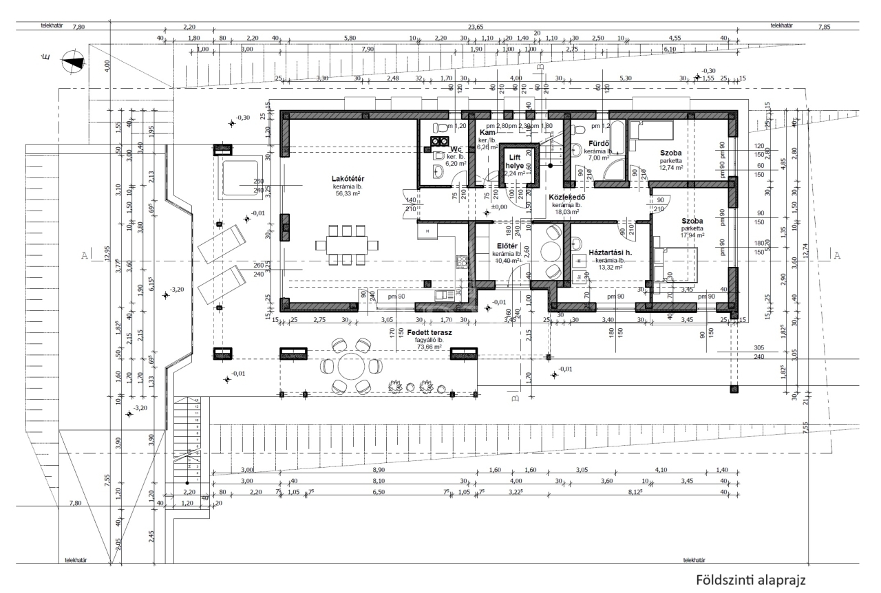 A 150 nm-es nettó alapterületű földszinten nagyméretű előszoba, 1 amerikai konyhás nappali, 2 hálószoba, 2 fürdőszoba, háztartási helység, kamra található. Körbe fedett 73 nm-es terasszal rendelkezik.