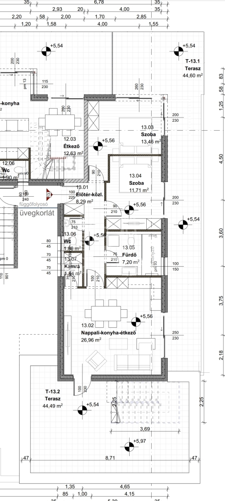A teraszkorlátok rozsdamentes-szálcsiszolt oszlopok és kapaszkodók lesznek, ragasztott biztonsági üvegtáblákkal.