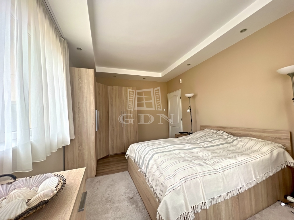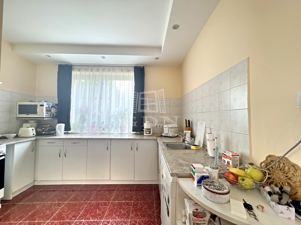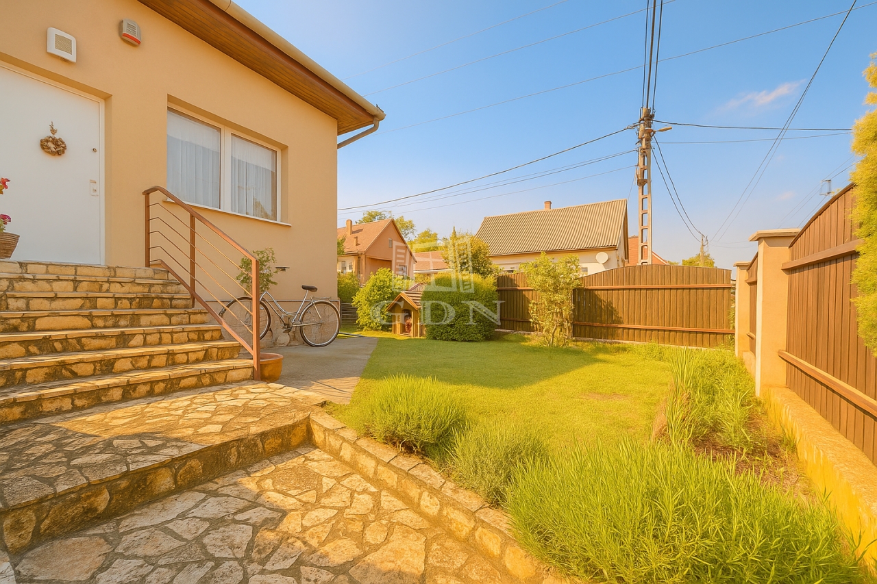 A kert rendezett, barátságos hangulatú, fedett kiülővel és kerti sütőhellyel. Ez az a tér, ahol a nyári esték természetesen telnek, különösebb szervezés nélkül. A házhoz terasz, garázs és több autó számára kialakított udvari parkoló is tartozik.