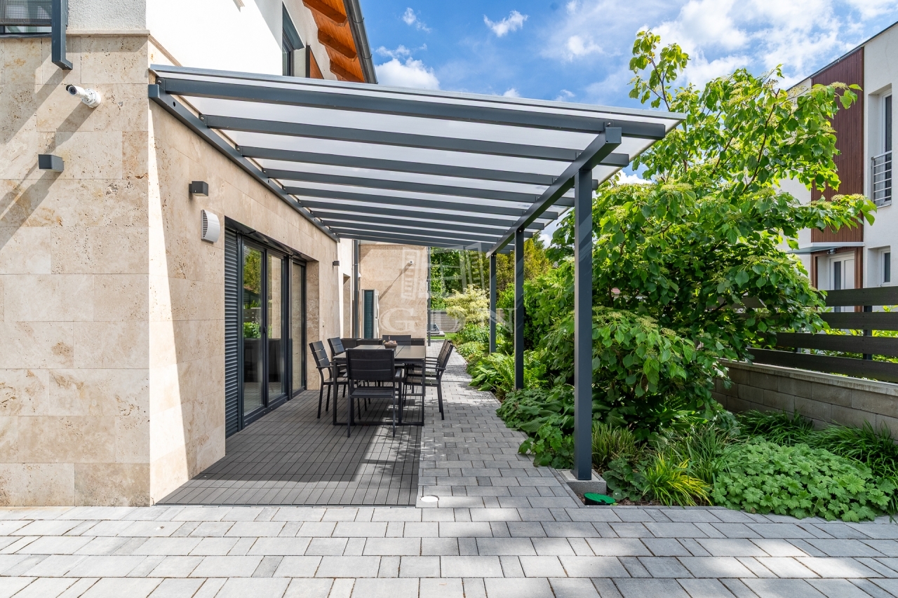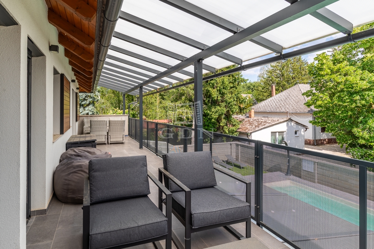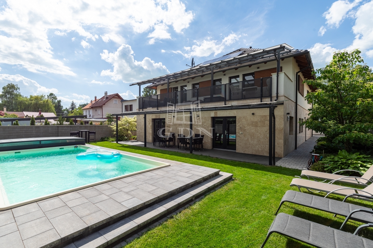 Az ingatlan kertész által gondozott kerttel, programozható öntözőrendszerrel, kamera-, beléptető- és riasztórendszerrel, valamint elektromos autó töltővel felszerelt.