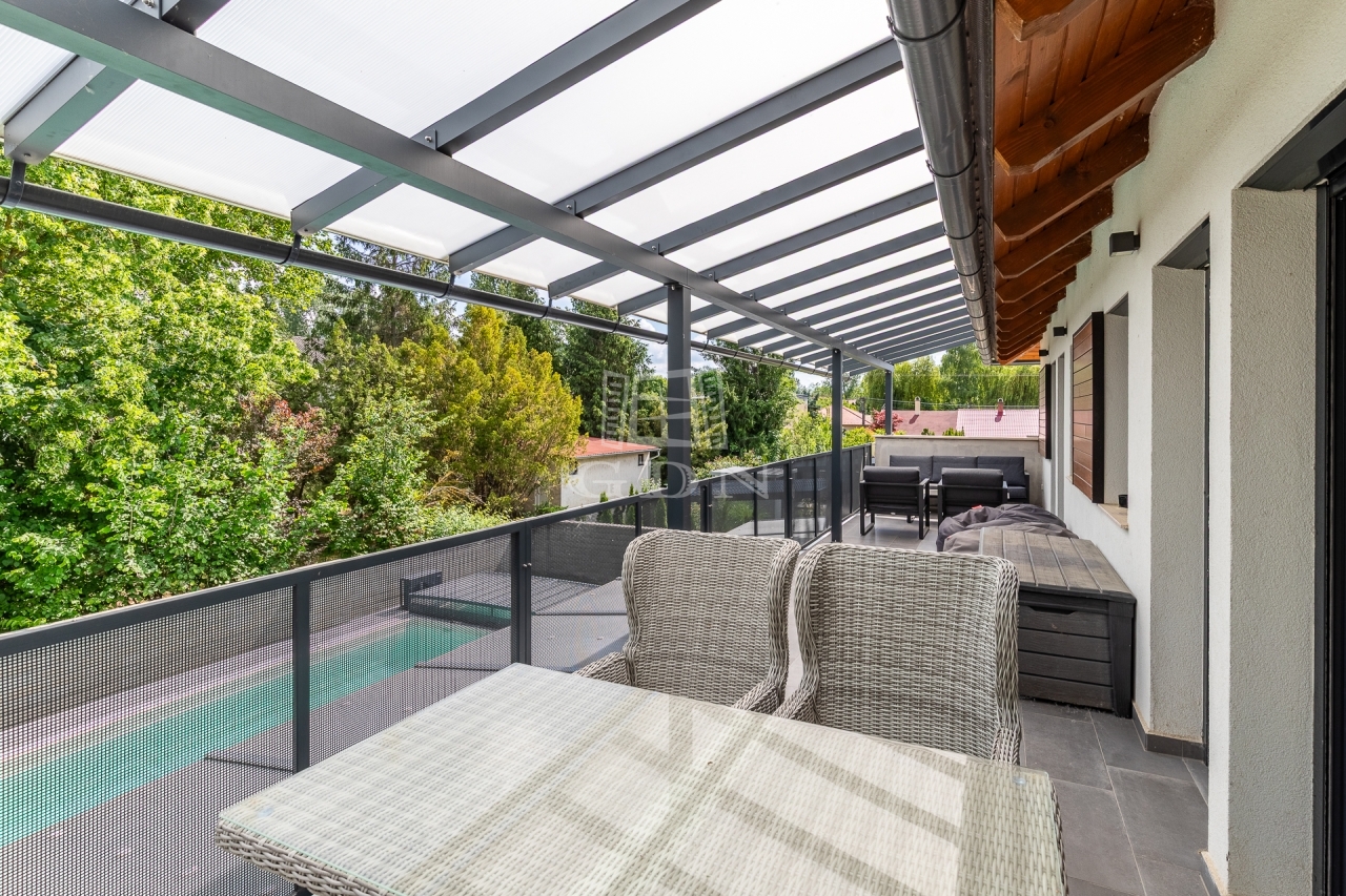 A telken kialakításra került egy 8x4 méteres távvezérléssel is fűthető, fedett, esti megvilágítással rendelkező medence, melyet térkövezett napozóterasz vesz körbe.