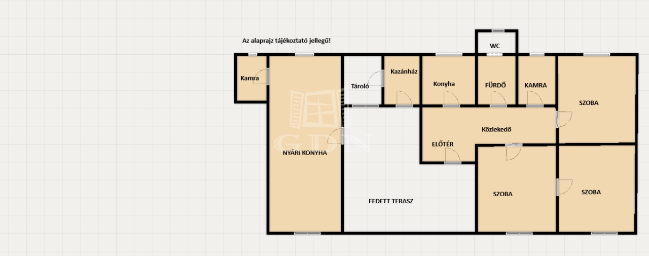 Bár jelenleg 3 nagy szoba (20-20 nm, 18 nm) van a házban, a fedett teraszról megközelíthető helyiségekből továbbiak kialakíthatóak. Az 50 cm-es vályog falak tökéletes állapotúak, vizesedés nem látható. Nagy melegben is kellemesen hűvös van az ingatlanban.