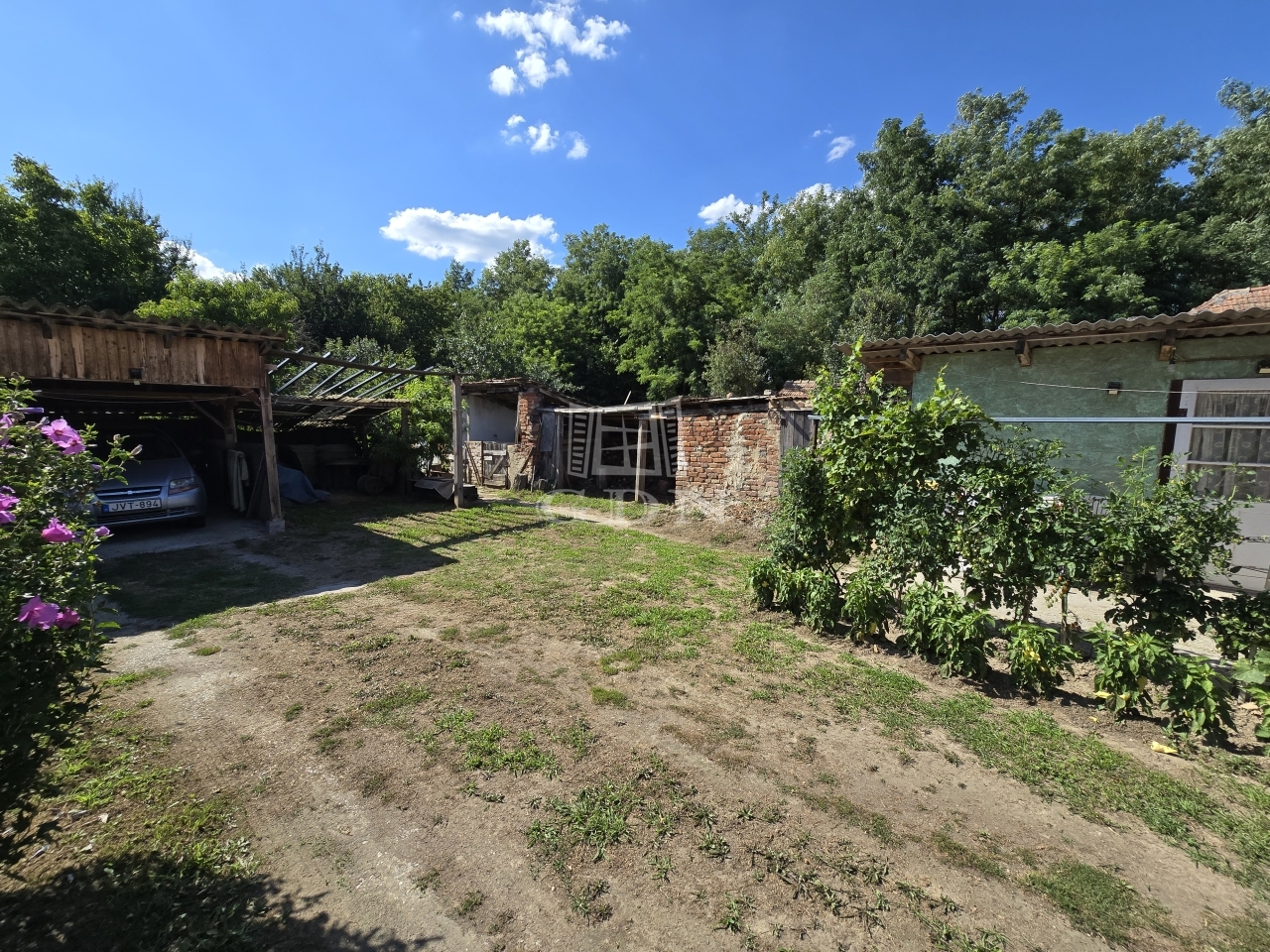A telek rendezett, gondozott, a házhoz tartozik továbbá egy nyitott, fedett garázs. A hátsó udvarrészen további zöld terület található, valamint a telek végében egy saját, erdősávval határos rész is rendelkezésre áll, amely természetes elkülönülést biztosít a pihenéshez.
