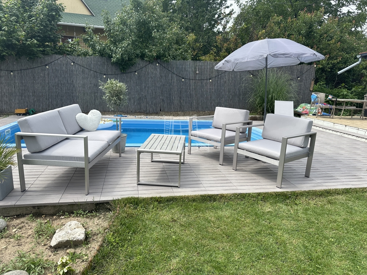 A parkosított kertben egy 6 X 3 méteres vízforgatós medence található. Ezen felűl egy 10 nm - es faház saját terasszal is rendelkezésre áll, amely ideális hobbinak vagy szerszámoknak.