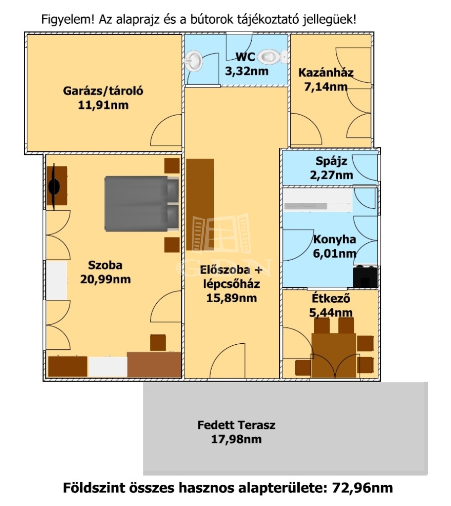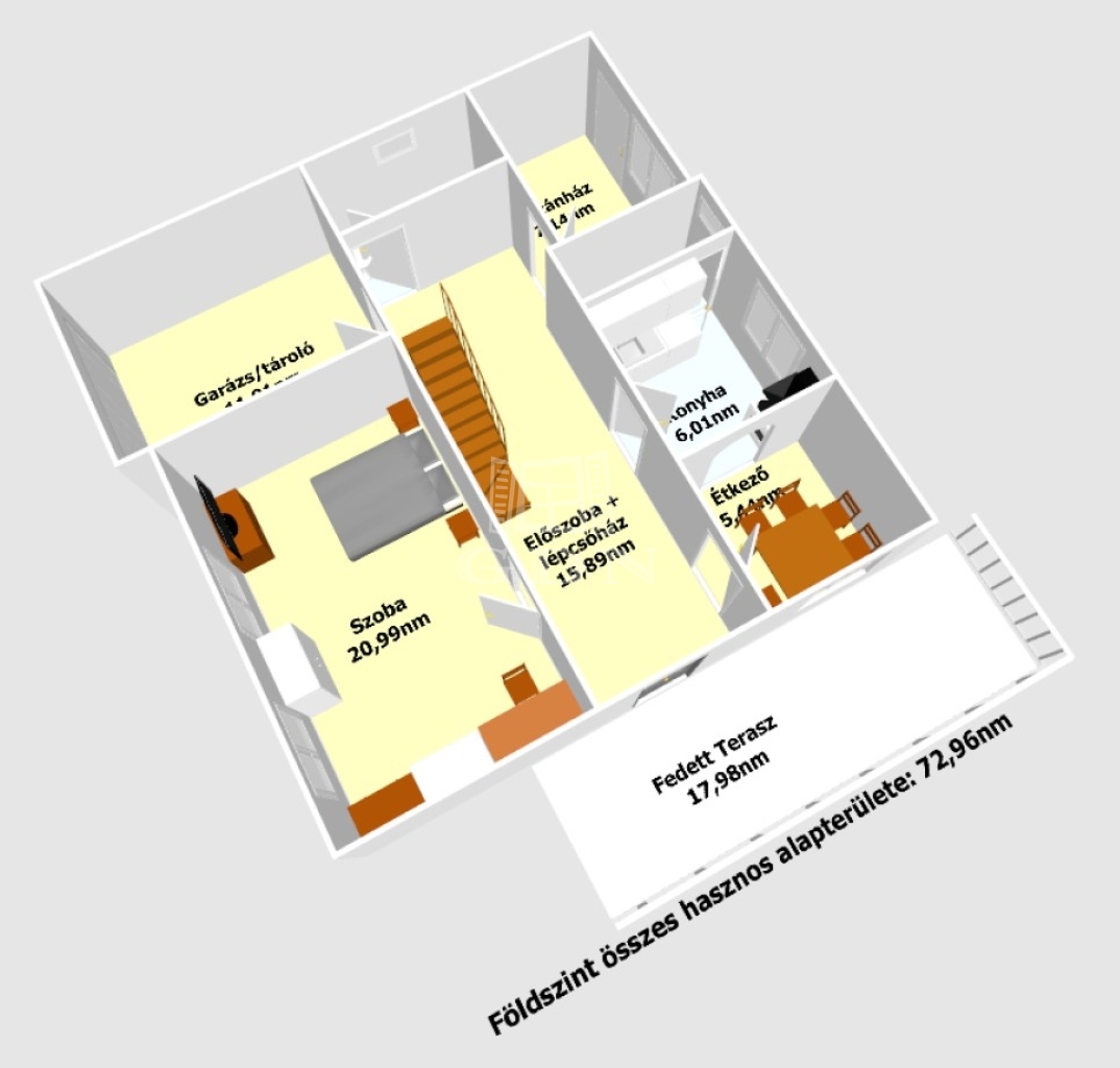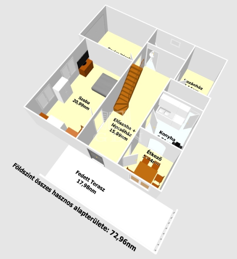 A lakóház nettó alapterületei a szinteknek:72,96+25,21+42,11nm, így összesen 140,28nm melyben található: