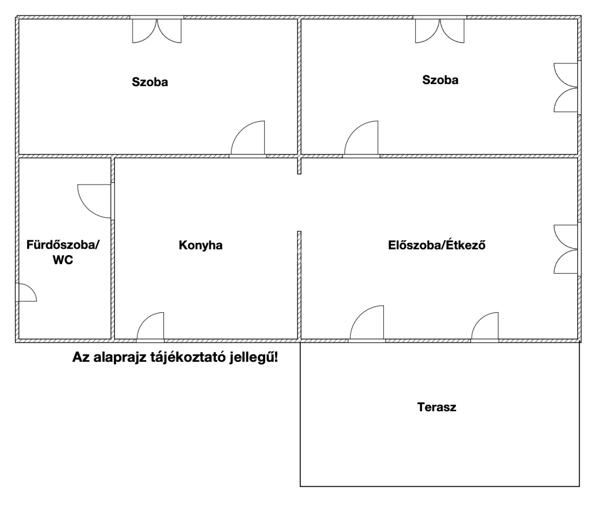 A teraszról az előszobába lépve került kialakításra az étkező, ahonnan nyílik egy szoba, illetve a konyha, melyben iparossal, egyedileg méretre készített konyhabútor található. A konyhából nyílik a fürdőszoba illetve még egy szoba. A fűtést gáz cirkó rendszer biztosítja.
