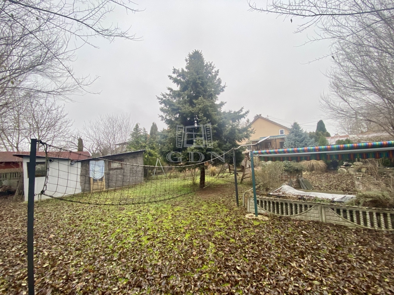 A kert igazi különlegesség: több, pihenésre alkalmas rész került kialakításra, keményfából épített fedett kiülővel, dupla gépkocsi-beállóval, kerti tóval, valamint gabion kerítéssel és kövekkel díszített magas ágyásokkal, örökzöld növényekkel. A kellemes hangulatról 2 db hintaágy is gondoskodik. A magas növényzettel körbevett telek teljes intimitást biztosít, elzárva a külvilágtól.