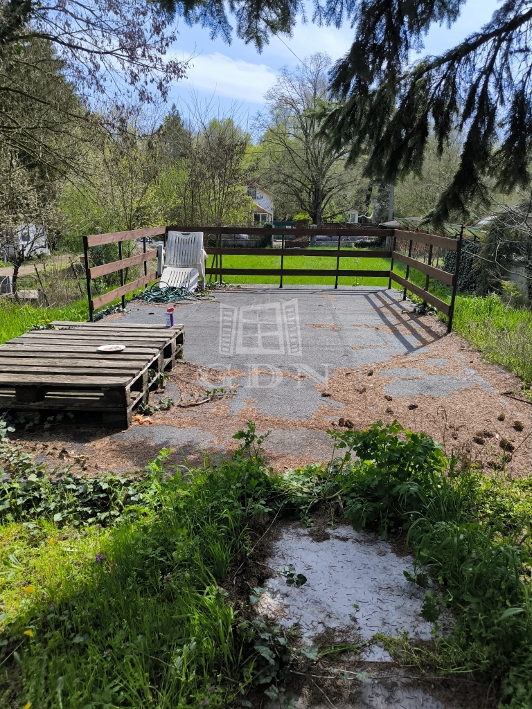 A telek kb.14,2 méter széles, a hátsó részén alapként is hasznosítható 3,4 méter x 6 méteres garázs. Belmagassága 2 méter, falazata csúsztatott zsalu. A szomszédos kút vize (mely akár az építkezés ideje alatt használható) bekötve, előtte beton vízgyűjtő lett kialakítva.