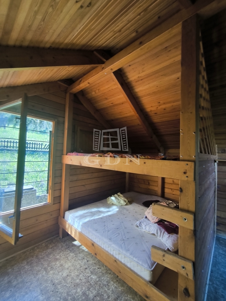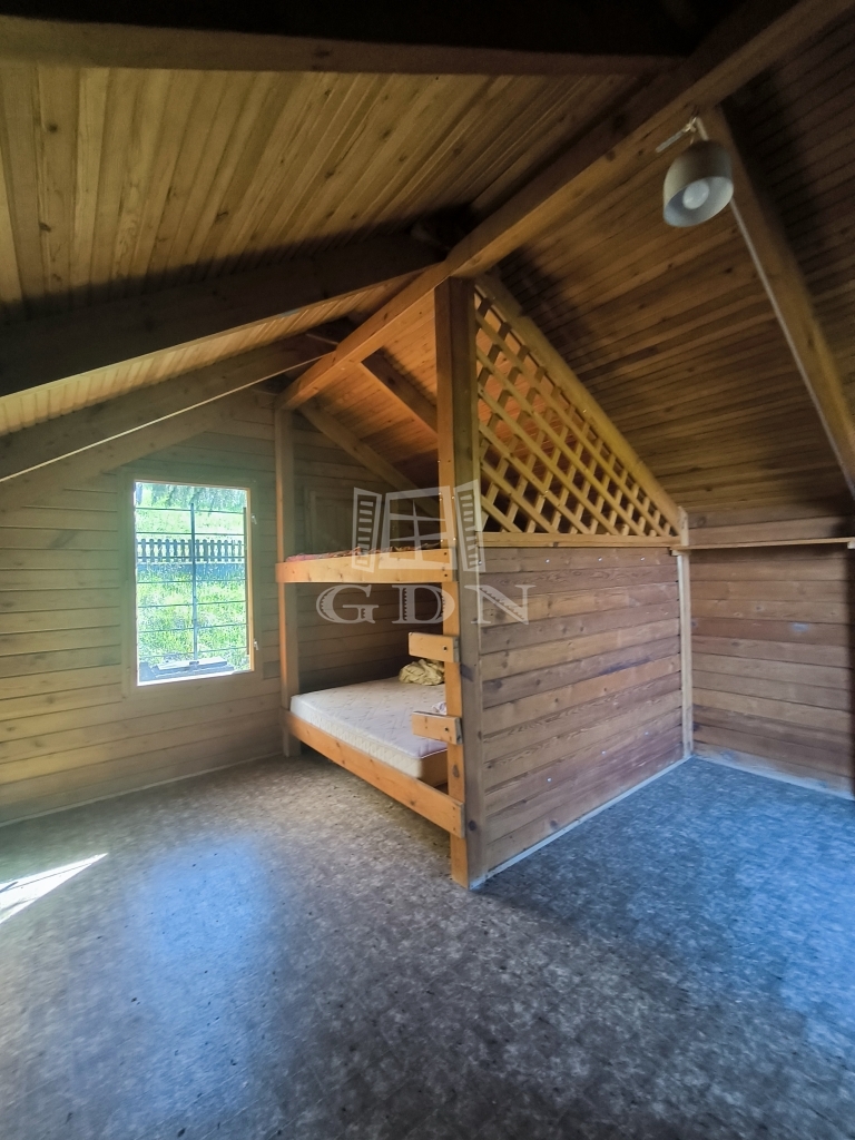 A felső szint egylégterű, fa szerkezetű. Itt emeletes ágy kapott helyet, szobaként funkcionált.
