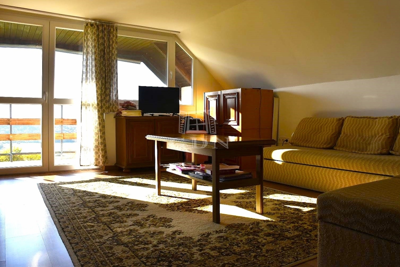 - A felső szinten egy otthonos, napfényes, tágas nappaliból nyílik az erkély, ahonnan csodálatos kilátás tárul elénk. Itt még két félszoba kapott helyett.