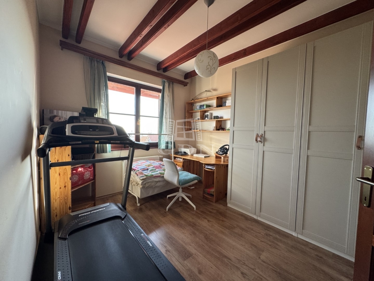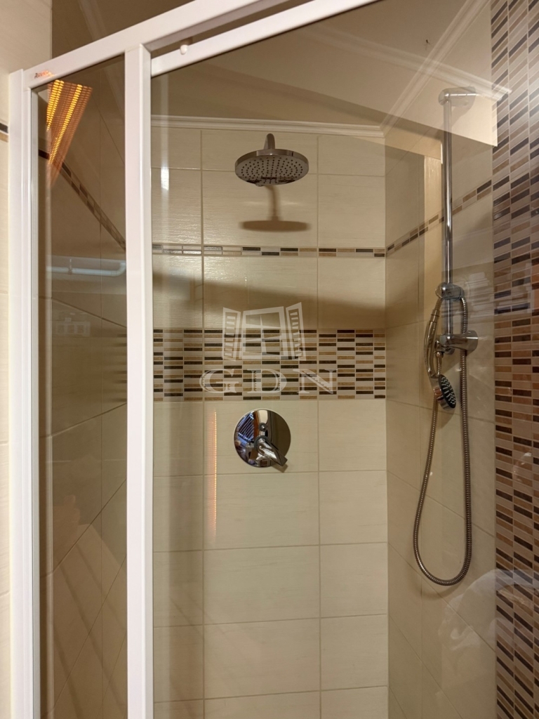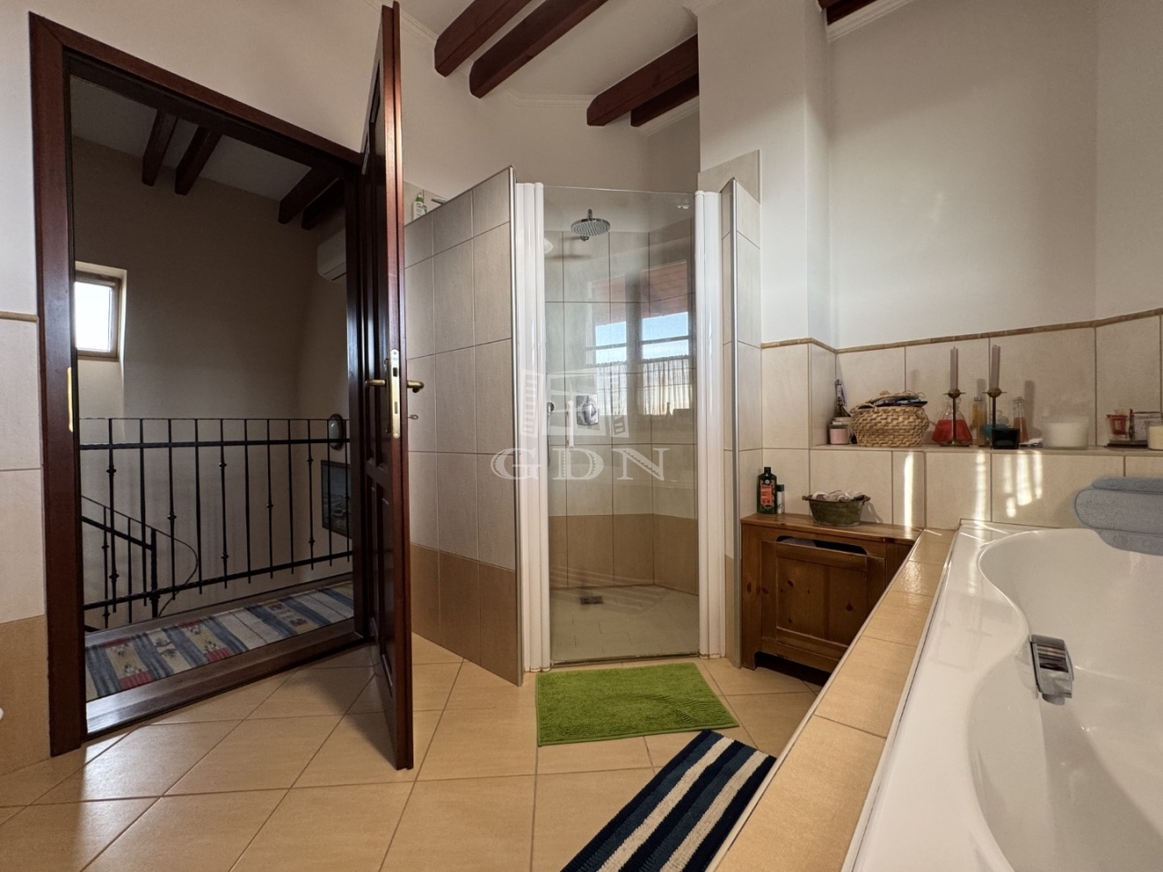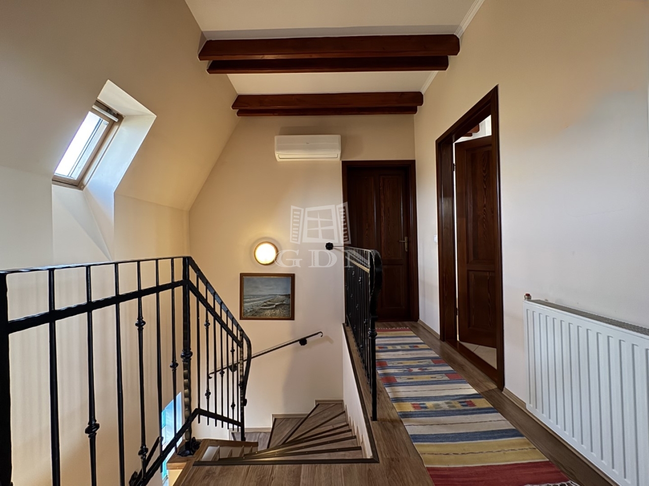 A kétrétegű üvegezésü, hőszigetelt nyílászárók, a magas minőségű hideg- és melegburkolatok, a dizájnos falpanelek, valamint a tetőtérben megjelenő látszógerendák természetes, elegáns megjelenést kölcsönöznek az otthonnak.