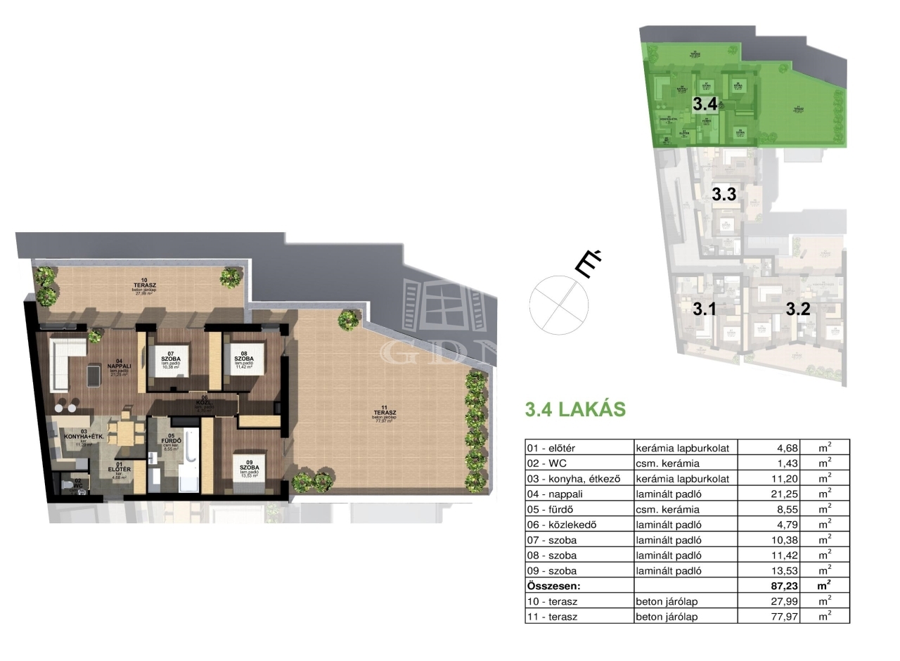 - amerikai konyhás nappali + 3 szoba (10,38 nm ; 11,42 nm ; 13,53 nm)