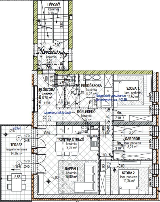 Szombathely belvárosában, a " költők utcái " városrészen csendes, átmenő forgalomtól mentes utcában hat lakásos társasházban, prémium kategóriás lakások, közös kertkapcsolattal eladók. Az ingatlanban mindenki számára alkalmas lakások épülnek. Egy szobástól - négy szobásig, 34 m2 - 86 m2 között. Különlegessége, hogy az első emeleti egyik lakása belső kétszintes. Az ingatlan magas műszaki tartalommal készül. A lakásokat elválasztó falazat hanggátló téglából épül. Homlokzatára 15 cm vastag EPS szigetelés kerül, dryvit vakolattal. Műanyag, fokozottan hang-és hőszigetelt nyílászárói kívül barna, belül fehér színű tokszerkezettel 3 rétegű üvegezéssel készül, redőnyökkel felszerelve. A tetőtérben Fakro ablakokra tervezett, hővédő árnyékolókkal. A fűtés, meleg vízellátás a mai kor követelményeinek leginkább megfelelő házközponti LG hőszivattyús fűtésrendszer kerül kialakításra, H tarifával, minden helyiségben padlófűtéses hőleadással. Napi és heti programozású digitális termosztátokkal. A fürdőszobákban a padlófűtés mellett, törölköző szárítós radiátorok lesznek kialakítva. A lakások nappalijában hűtő-fűtő klíma kerül. Villanyhálózata 3 x 16 Amper teljesítményű. Választható hideg-meleg burkolatok, szaniterek, csaptelepek, beltéri ajtók. Zárt, parkosított udvarában felszíni parkolók, fedett gépkocsibeállók vásárolhatók. Az ingatlan klasszikus, igényes külső megjelenése belvároshoz méltó. A hirdetésben szereplő lakás L3-as, 81.18 m2, +14.16 m2 terasz. Első emeleti, 4 szobás lakás, kertre néző terasszal.