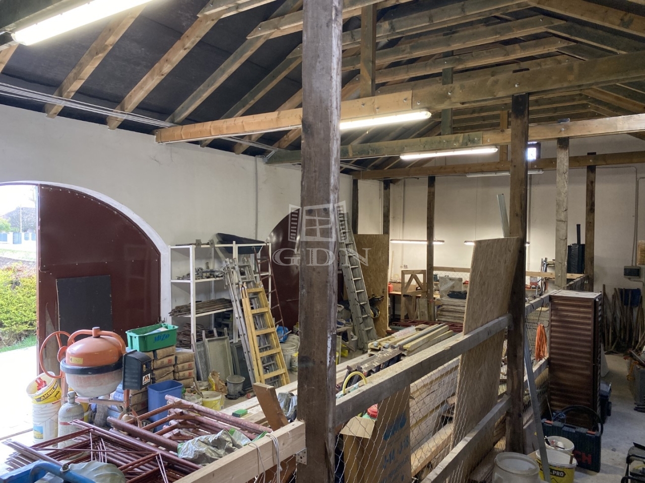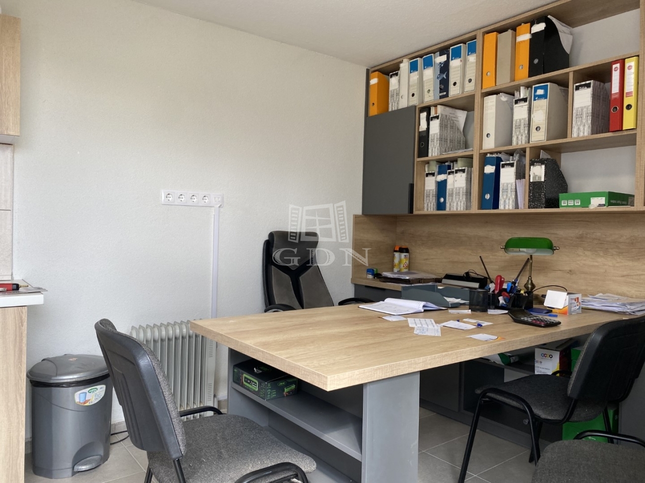 Az épület első 2/3 része jelenleg egy közel 140m2-es, egyterű, galériás, nagy belmagasságú tárolóként funkcionál, illetve tartozik hozzá egy iroda is, ami akár lehetőséget ad vállalkozás helybeni üzemeltetésére, vagy akár még egy lakrész kialakításához is.