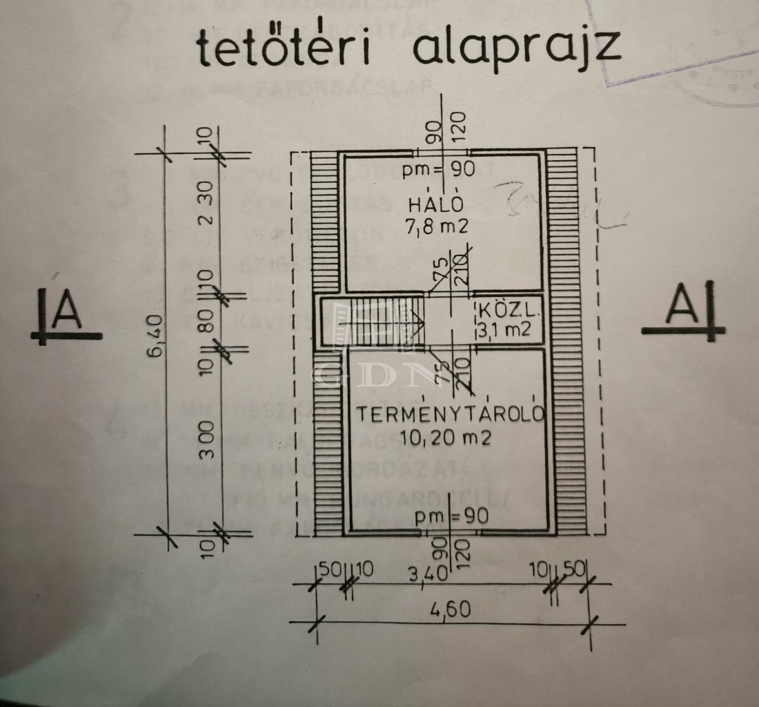 Az alsó szint 26 nm (+ fedett terasz 14 nm), a tetőtér bruttó 18 nm, összesen 44 nm.